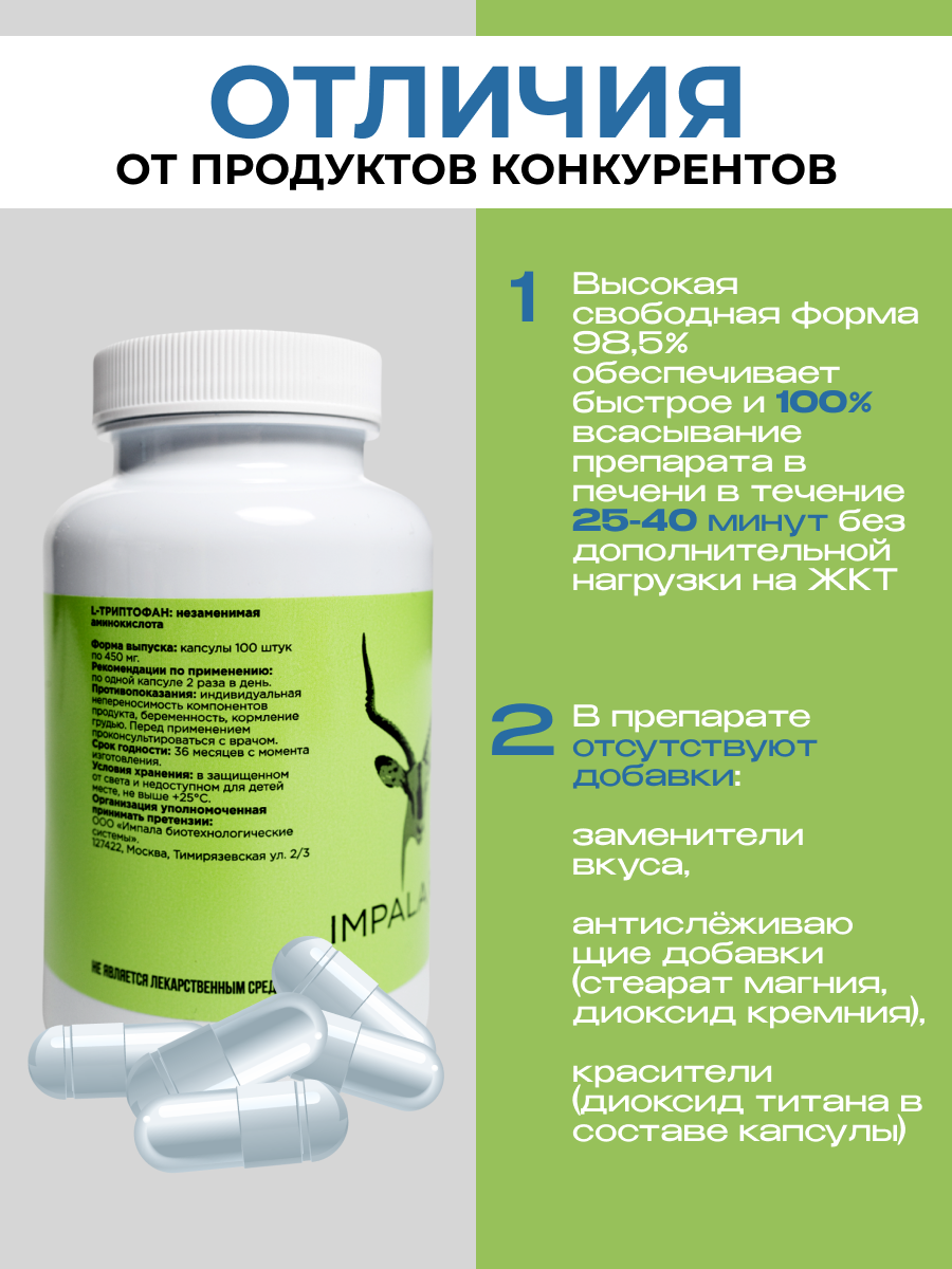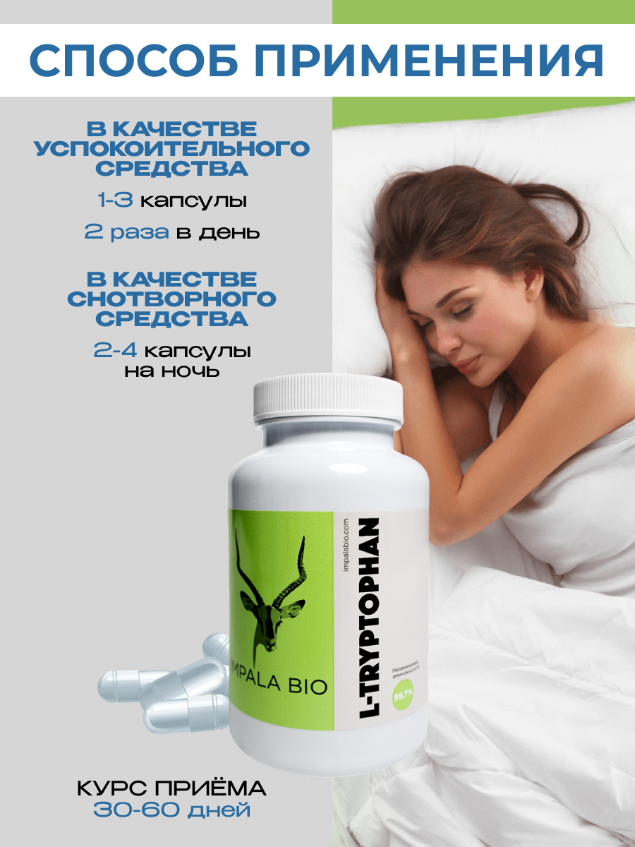 L-Триптофан — натуральный антидепрессант и эффективное снотворное средство. Аминокислота служит непосредтсвенным сырьем для синтеза серотонина — нейромедиатора, успокающего психику и создающего ощущение эмоционального благополучия. Триптофан эффективен при лечении бессонницы, депрессии, повышенной тревожности, а также сезонных аффективных растройствах ("осенней депрессии").